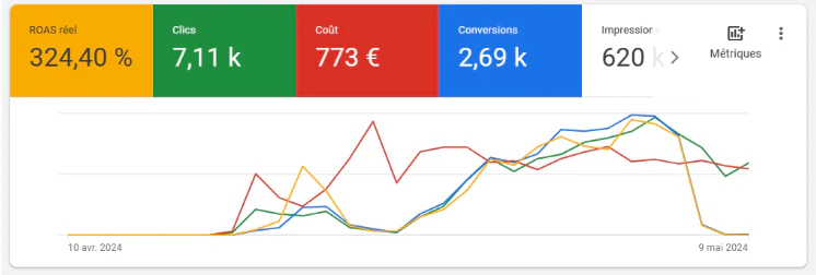 La mise en place d’une campagne publicitaire pour cette entreprise de rénovation a explosé, générant ainsi un ROAS* de 324.40% pour seulement 773€ de budget publicitaire, témoignant ainsi la puissance d’une campagne publicitaire bien élaboré.